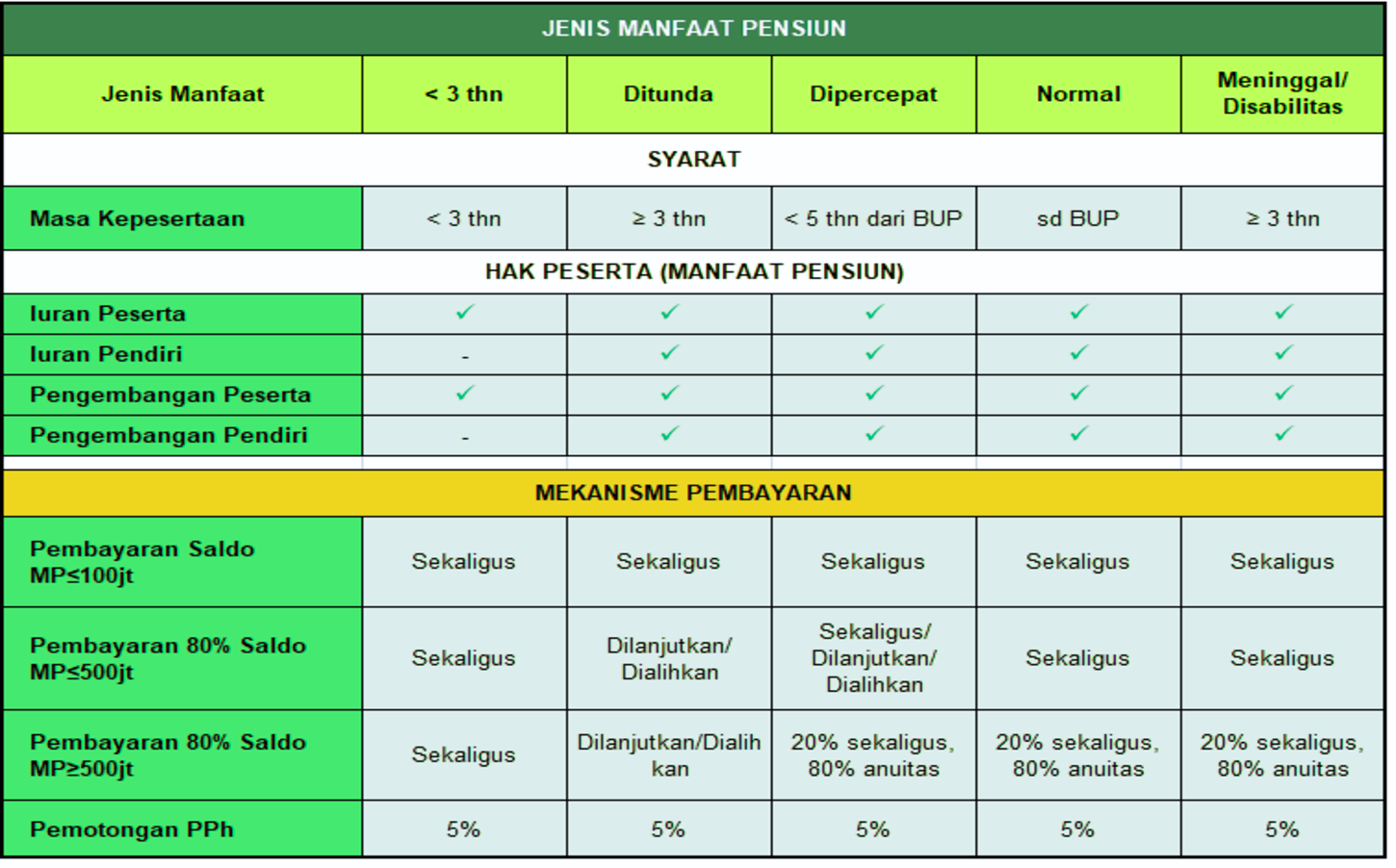 Mari pahami setiap jenis manfaat pensiun dari tabel ini, termasuk syarat masa kepesertaan hingga detail mekanisme pembayaran. Dengan menguasai informasi ini, Anda dapat merencanakan hak pensiun dan keuangan masa depan Anda secara tepat.